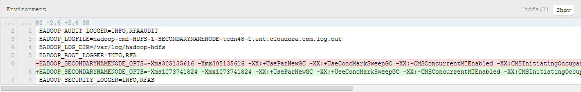 • Environment - represents environment variables set for the role. For example, the following entry shows the change to the environment that occurs when you update the heap memory configuration of the SecondaryNameNode.