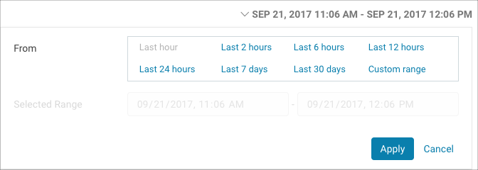 - Click the arrow next to the current date range field to open the date and time range options selector. Time frame options range from the last 2, 6, 12, or 24 hours to the last 7 or
